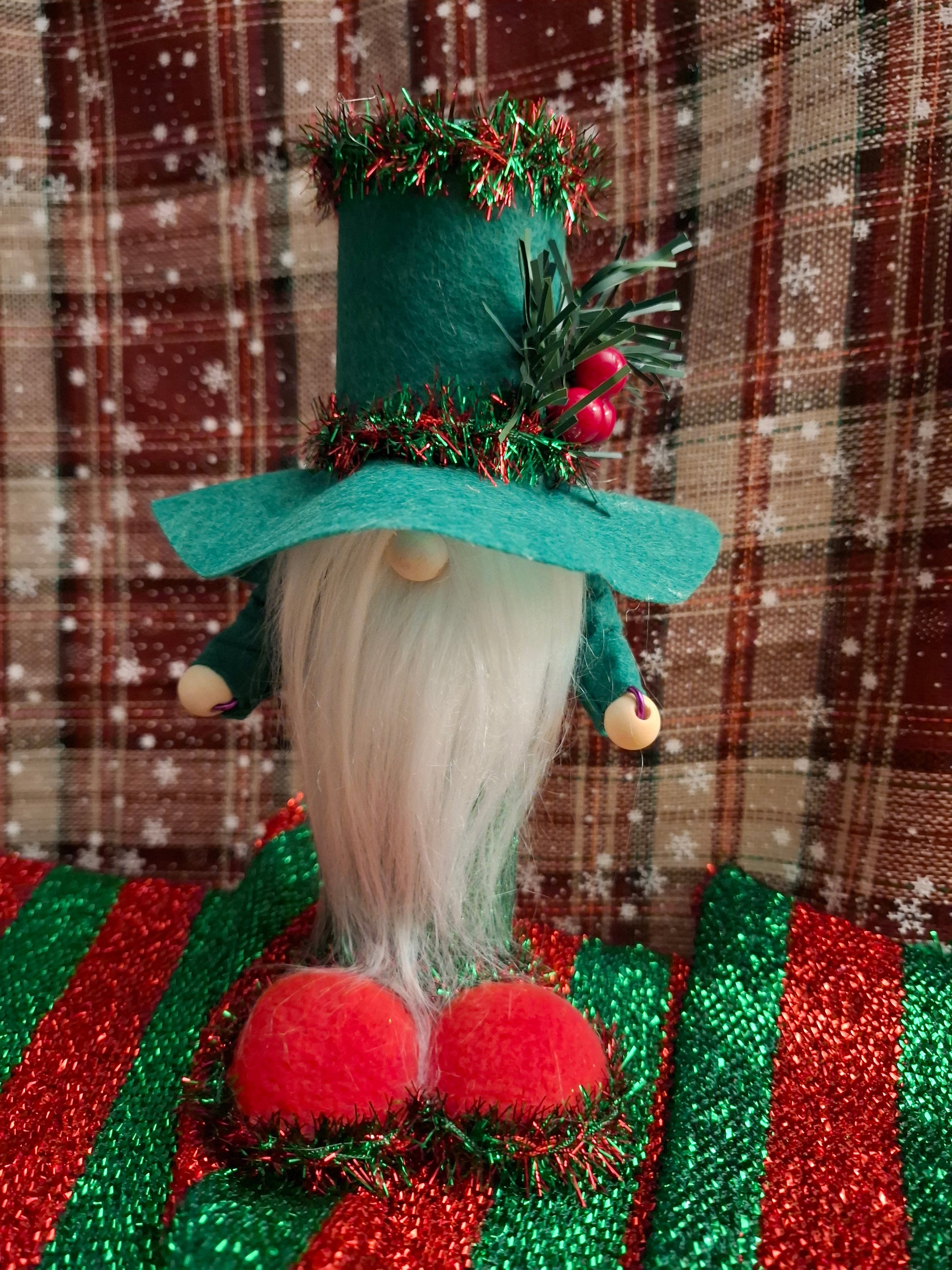 This charming handmade Christmas gonk is craftedΒ  from recycled materials, giving festive magic a sustainable twist! Featuring a tall green top hat trimmed with red and green tinsel, a fluffy white beard, and bright red feet, this gonk adds a touch of eco-friendly cheer to any holiday display. β™»οΈβœ¨